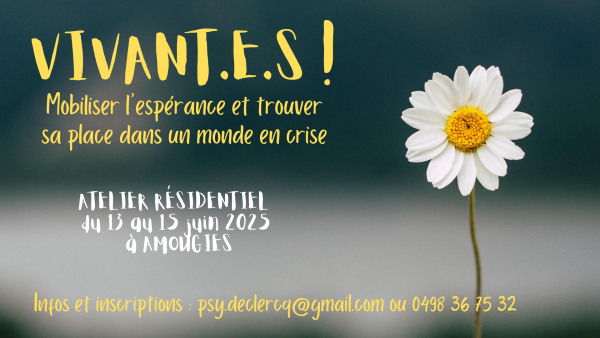 Juste avant l’arrivée de l’été, nous vous proposons un week-end de Travail qui relie pour mobiliser vos ressources et trouver votre place dans le monde d'aujourd'hui. Nous expérimenterons le processus du Travail qui relie initié par Joanna Macy dans les années 70 à travers des pratiques qui visent à nourrir l’espoir actif, l’espérance en mouvement, pour éviter l’inertie, l’abattement, l’apathie suscitées par nos peurs, notre colère et nos tristesses. Si vous vous sentez perdu.e, angoissé.e, démuni.e, seul.e, etc. face aux nombreuses crises que nous traversons, cet atelier est peut-être pour vous ! Nous logerons dans un gîte et pourrons profiter d'un environnement verdoyant. La cuisine sera réalisée sur place, bio et végétarienne. Ce week-end est accessible à tou.te.s, aucun prérequis n'est nécessaire. Il se déroulera du vendredi 13 juin 2025 à 18h30 (accueil) au dimanche 15 juin 2025 à 16h. Prix : 115€ de frais de base (logement et nourriture). Le travail des facilitatrices sera rémunéré en participation consciente à la fin du week-end. Lieu : Amougies Min. 6 et max. 14 participants (en dessous du minimum, nous nous donnons le droit d'annuler l'événement). Inscriptions via ce formulaire : https://framaforms.org/atelier-de-tqr-vivantes-du-13-au... Pour plus d’informations : psy.declercq@gmail.com (Laetitia) ou 0498 36 75 32 (Anne-Chantal)